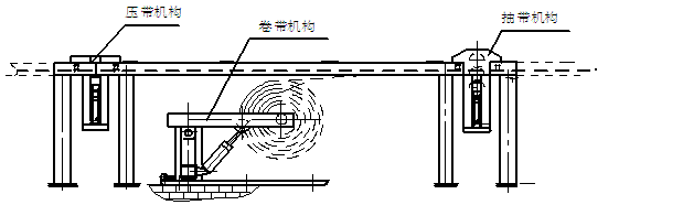 2、 啟動拉緊機構(gòu)進行松繩,拉緊小車同時送開皮帶。開啟抽帶機構(gòu)的液壓馬達驅(qū)動固定輥,使其順時針旋轉(zhuǎn),通過固定輥和活動輥的摩擦力將皮帶滾出,使皮帶在壓帶機構(gòu)和抽帶機構(gòu)之間縮曲,用剪刀剪斷,將皮帶斷頭安裝在卷帶機上。