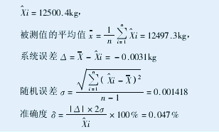 數(shù)據(jù)統(tǒng)計誤差通常分隨機(jī)誤差和系統(tǒng)誤差。隨機(jī)誤差是在實際測量條件下多次測量同一量值時,誤差的絕對值和符號以不同方式變化著的誤差。它反映了被測檢驗裝置的精度,隨機(jī)誤差越小,說明其精度越高。系統(tǒng)誤差是在偏離規(guī)定的測量條件下多次測量同一量值時,誤差的絕對值和符號保持恒定的誤差。系統(tǒng)誤差反映了被測檢驗裝置的正確度,系統(tǒng)誤差越小,說明其正確度越高。評價檢驗裝置的精度既不能單獨看其隨機(jī)誤差,也不能單獨考查其系統(tǒng)誤差,而是要對其進(jìn)行綜合分析和計算,從而確定被測檢驗裝置的綜合指標(biāo),即準(zhǔn)確度(此時不討論誤差分配問題)。2003年8月23日在現(xiàn)場測試循環(huán)鏈碼稱量數(shù)據(jù)10次:12496  12497  12498  12495  12499  12496  12497 12499 12497 12499,通過對循環(huán)鏈碼總重量計算值為